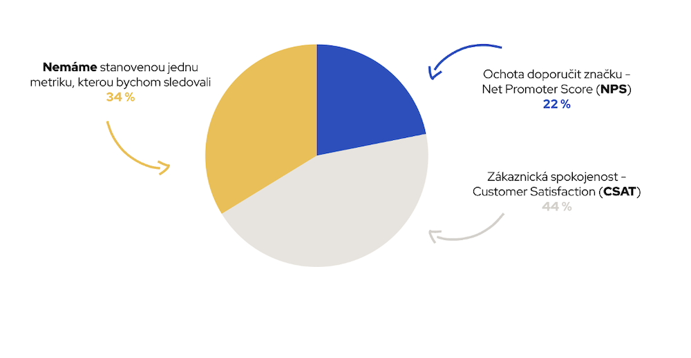 Více než třetina firem respondentů nemá stanovenou jasnou metriku pro měření CX. Přes  40 % pak spoléhá na zákaznickou spokojenost (CSAT) a necelá čtvrtina pak sází na ochotu doporučit značku, tedy Net Promoter Score (NPS). To je celkem překvapivé zjištění, protože právě NPS je zlatým standardem, pokud jde o dlouhodobé sledování CX.