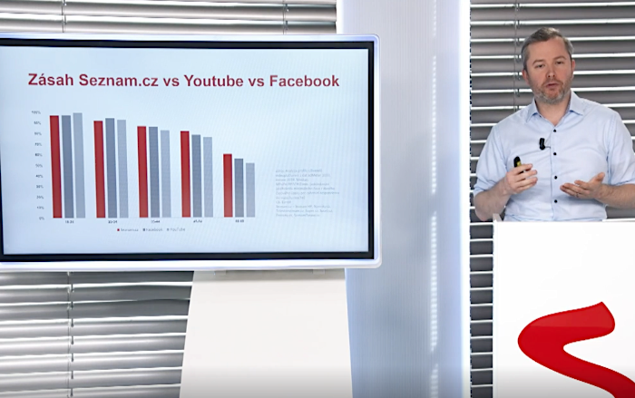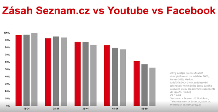 Zásah videí na webech provozovaných společností Seznam.cz má být celkově srovnatelný se zásahem, jakého na českém trhu dosahují na poli videa nadnárodní platformy Facebook a YouTube. Na čtvrtečním Sklik Expert fórum, pořádaném společností Seznam.cz, to uvedl manažer videoreklamy Seznamu Petr Daneš. Prezentoval zde výsledky výzkumu od společnosti Median, podle kterého má nejvyšší zásah v mladších skupinách do 24 let YouTube (v grafu níže označený světle šedou barvou), ve skupině do 34 let Facebook (tmavě šedá), naopak ve skupinách nad 35 let má mít Seznam.cz nejvyšší zásah (červená).