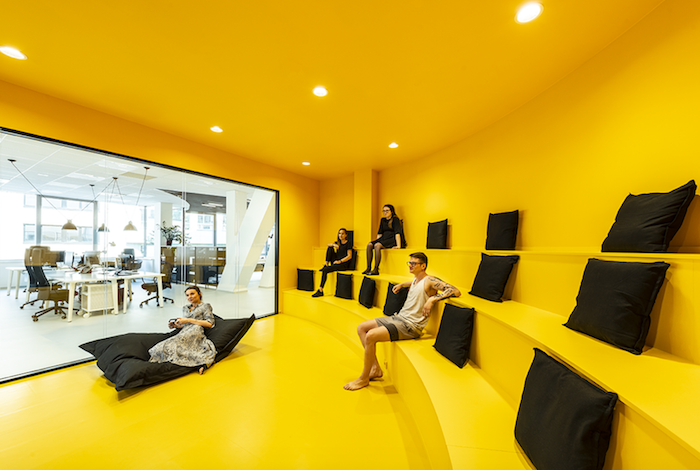 Celý prostor navrhla naše architektka Bára Bencová z B² Architecture. Vtipné bylo, že jsme měli vše už připravené, a když jsme se dozvěděli o nové vizuální identitě, museli jsme všechno přes víkend předělat. Ale povedlo se, dostali jsme dokonce pochvalu i od naší globální CEO Wendy Clark a Barry Quinn, Chief Design Officer, který novou vizuální identitu vytvořil, řekl, že je to zatím nejlepší aplikace na světě. Díky tomu nám píšou kolegové z celého světa o rady.