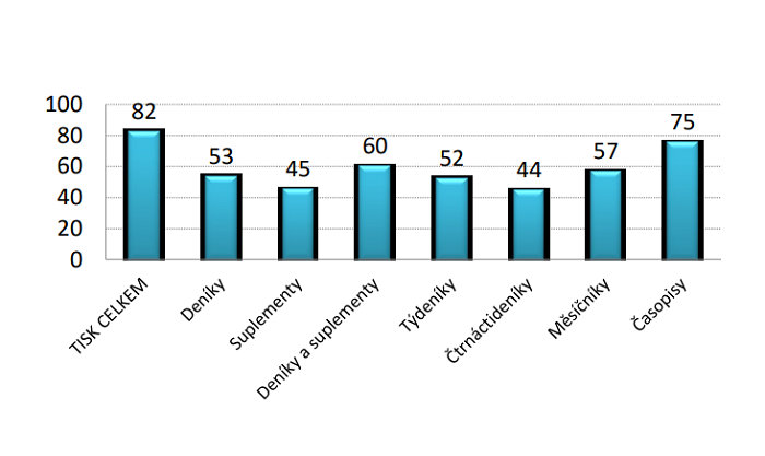 Celkově čte tištěná média podle nových dat 82 % populace ve věku 12 až 79 let. Toto číslo se ve srovnání s předešlým měřeným obdobím téměř nemění (-1 pb.). Deníky a jejich suplementy čte zmíněných 60 % populace a čtenost časopisů dosahuje 75 %, což je absolutně 6,6 mil. osob.