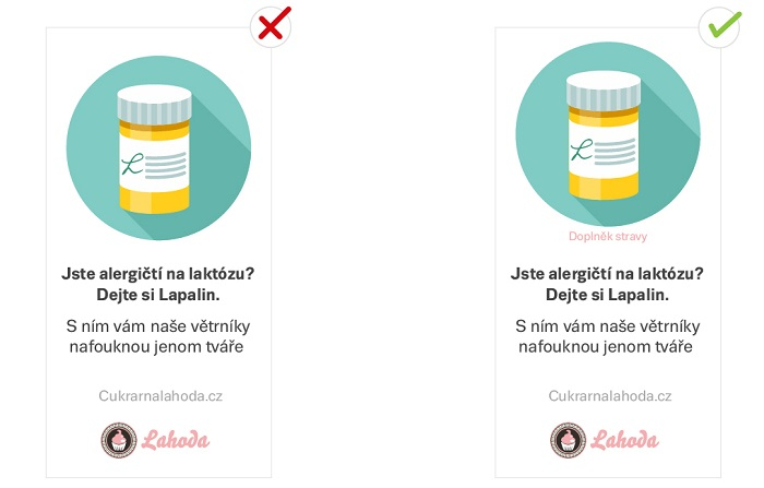 Aby si uživatelé nemysleli, že jim konzumace pilulek zajistí pevné zdraví, či zlepší cokoliv jiného, aniž by jedli pestrou stravu nebo sportovali, je nutné jim to oznámit už v reklamě samotné. Kdyby se tak nestalo, hrozí jak inzerentovi, tak nám, pokuta za nedodržení zákona, který označování reklamy nařizuje.