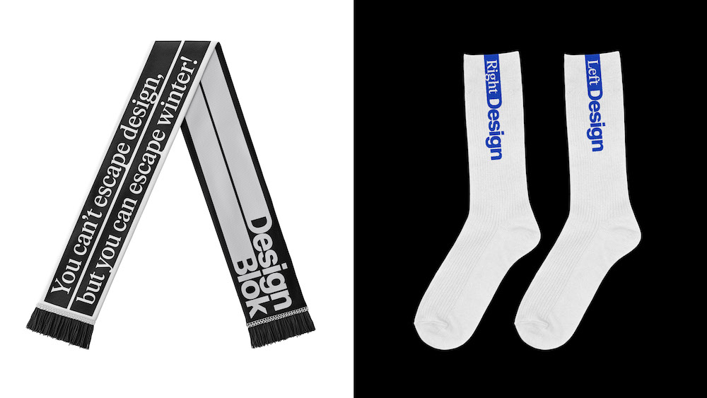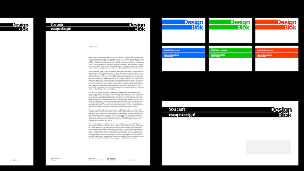 Kromě nosných grafických prvků bloku a pruhů používá identita fonty FK Grotesk Neue a FK Roman Standard z dílny české pismolijny Florian Karsten Type Foundry typografa Květoslava Bartoše, nové logo se promítá také do změny psaní slova DesignBlok s velkými písmeny D a B.
