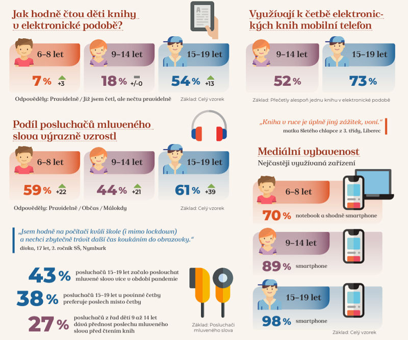 Zejména u dospívající mládeže vzrostl ve srovnání s rokem 2017 podíl nepravidelných čtenářů elektronických knih (ze 41 % na 54 %), počet pravidelných čtenářů knih v elektronické podobě však zůstal na stejné úrovni. Nejčastěji využívají k četbě elektronických knih mobilní telefon. Ve všech věkových kategoriích ve srovnání s rokem 2017 výrazně vzrostl podíl posluchačů mluveného slova. Významná část posluchačů z řad dospívajících (43 %) uvedla, že mluvené slovo začali poslouchat více v období pandemie, 38 % dává u povinné četby přednost audioverzi před povinnou četbou.