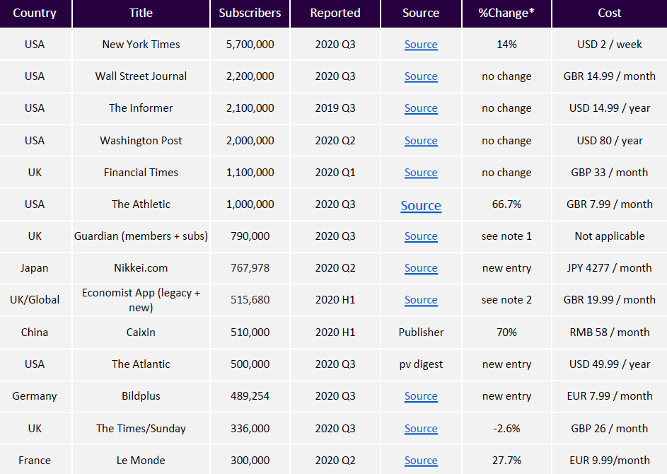 Pandemie koronaviru dolehla výrazně i na média a jejich reklamní výnosy, které se v souvislosti s krácením marketingových rozpočtů mnohých zadavatelů snížily. Nicméně právě s Covid-19 spojená karanténa a omezení pohybu přispívá ke zvyšování digitálního předplatného, které si lidé zaplatí ve snaze získávat relevantní informace o aktuální situaci. Jen americký deník The New York Times získal během druhého letošního čtvrtletí 669 tisíc nových digitálních předplatitelů a s celkovým počtem 5,7 mil. digitálních předplatitelů je v čele světového žebříčku. Dařilo se však i jiným titulům, mimo jiné i slovenskému Denníku N, jak vyplývá z reportu organizace FIPP.