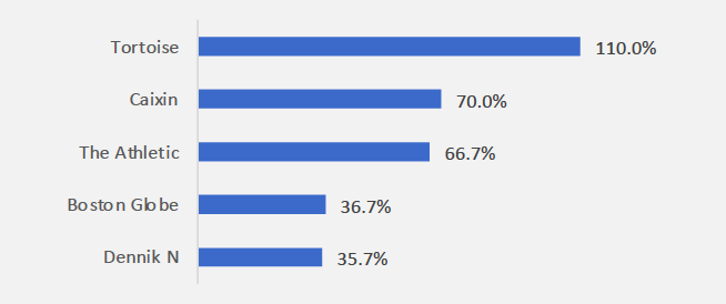 The New York Times však není jediný titul, kterému se na poli digitálního předplatného daří. Největší nárůsty zaznamenaly britský Tortoise, čínský Caixin, americký The Athletic a Boston Globe a slovenský Denník N.