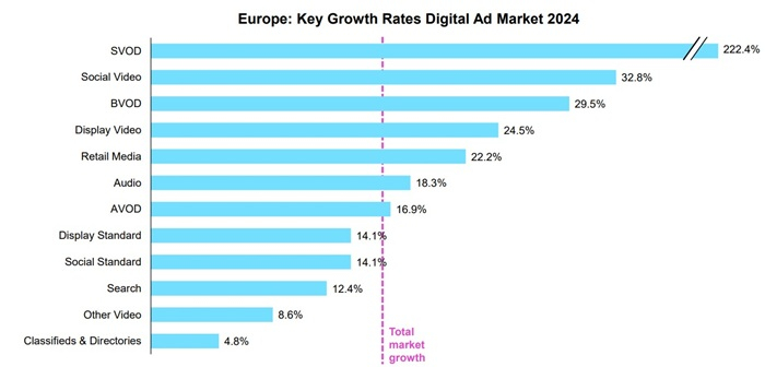 Evropský trh digitální reklamy dosáhl v roce 2024 dvouciferného růstu, konkrétně o 16 %, a poprvé překonal hranici 118,9 mld. euro. Vyplývá to z pravidelné výroční zprávy AdEx Benchmark 2024 od IAB Europe, která byla v těchto dnech zveřejněna. K nejsilněji rostoucím se zařadily video (+24,5 %), a to především díky reklamním formátům připojené televize (CTV), sociální média (+24 %) a retail média (+22 %). Zájem si podržela reklama v digitálním audiu (+18 %) a znovuoživení s růstem 18 % zaznamenala programatická online reklama.