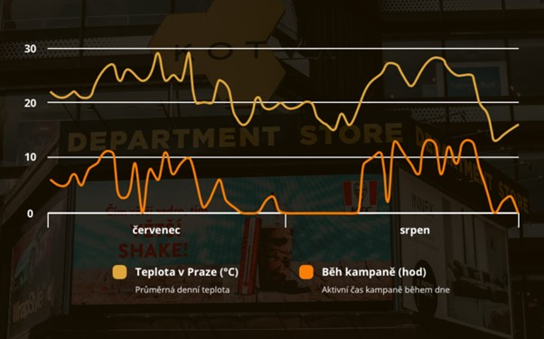 Během července a srpna probíhala kampaň na digitálních billboardech OC Kotva a Magistrála Kačerov. Bylo nastaveno zobrazení v čase 9:00 – 22:00. Data z kampaně ukázala, že podmínky pro její běh byly splněny v průměru 7 hodin a 15 minut denně. Přiložený graf ukazuje vývoj počasí a zobrazování kampaně období běhu kampaně.