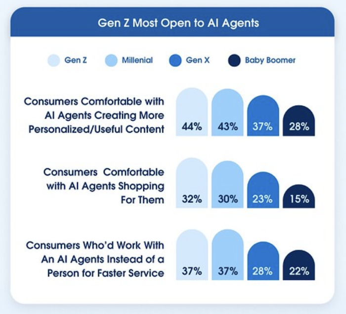 Umělou inteligenci při nákupu jsou ochotnější využívat mladí spotřebitelé z generace Z a mileniálů. Více než třetina (37 %) by s agentem AI spolupracovala raději než s lidskou obsluhou kvůli rychlejší obsluze, motivací je i možnost vyhnout se opakování. Zhruba třetina by s ním i sdílela své osobní údaje, aby mohl lépe předvídat jejich potřeby.