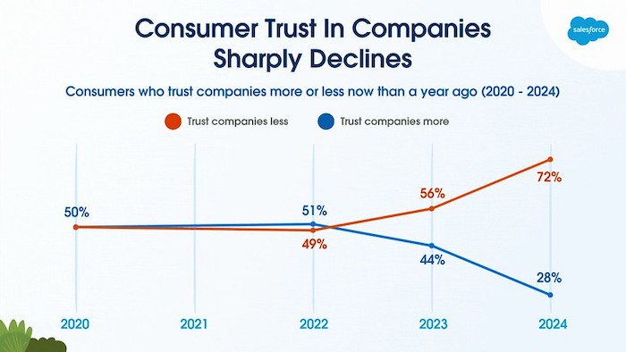 Důvěra spotřebitelů ve firmy je v současnosti rekordně nízká. Rozvoj umělé inteligence přitom nároky na značky ještě zvyšuje. Podle 60 % spotřebitelů je právě kvůli AI důvěra ještě důležitější. Vyplývá to z aktuálního průzkumu State of the AI Connected Customer společnosti Salesforce.