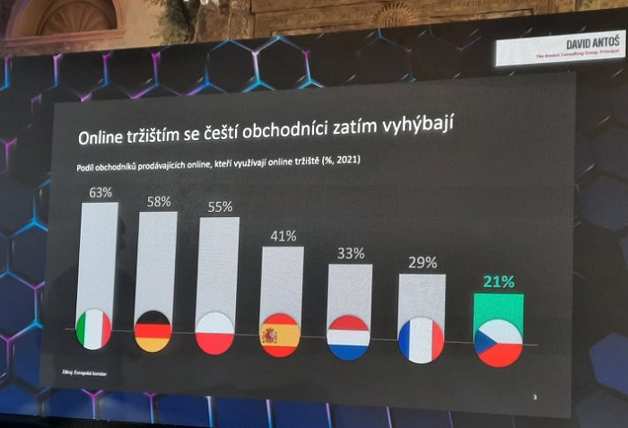 David Antoš, ředitel Boston Consulting Group, představil výzkum, ve kterém bylo dotazováno 500 lidí na názor na česká tržiště (bez kategorie potravin). Česko je paradoxně podle něj ve vývoji co se online tržišť týče spíše pozadu, zatímco jinak v online jsme napřed. Podíl obchodníků prodávajících online, kteří využívají v ČR online tržiště, byl loni jen 21 %. Například v Německu je to 58 % a v Polsku 55 %. Naopak z různých průzkumů vyplývá, že máme asi nejvíc e-shopů na hlavu ze všech zemí Evropy.
