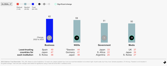 Globálně se společnost potýká s institucionální nevyrovnanost, způsobenou vysokým procentním rozdílem mezi důvěrou lidí ve vládu a byznys. Vládě (51 %) a médiím (50 %) věří lidé nejméně, zatímco nejvíce důvěry panuje v podnikatelskou sféru (62 %) a nevládní organizace (59 %).