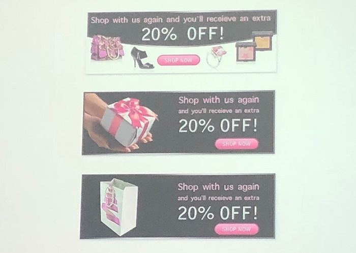 Pokud je komunikována sleva, účinnější je podle Watsona ukázat konkrétní produkty než jen zabalený dárek. Ze tří níže uvedených vizuálů byl nejúspěšnější první z nich – konverze byla ve srovnání s dalšími dvěma o 30 % vyšší.