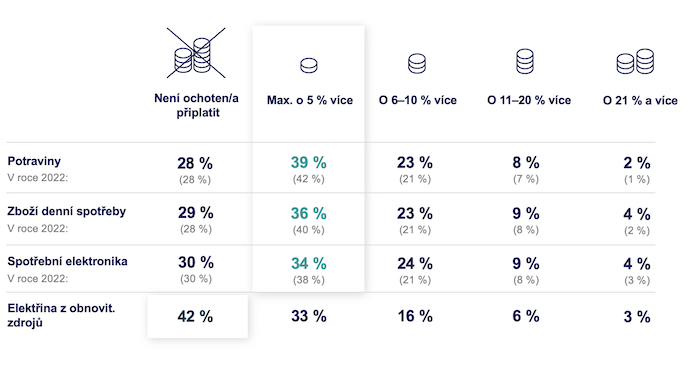 Polovina Čechů je také ochotna si připlatit za odpovědné nebo udržitelné produkty, nicméně jen symbolicky, nejvíce o maximálně 5 %. Tato ochota se navíc kvůli inflaci za poslední dva roky snížila.