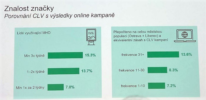 Určitou výzvou bylo nastavení online kampaně tak, aby se nejvíce podobala charakteru probíhající CLV kampaně, se kterou mohl přijít do kontaktu prakticky každý obyvatel jihomoravské metropole. „Maximalizovali jsme tedy její zásah s omezením frekvence na dva kontakty denně. A stejně jako obyvatele Brna jsme na konci měsíce dotazníkem oslovili i respondenty z Ostravy a Liberce. Výsledky jsme následně přepočetli na celou, nikoli pouze online populaci obou měst a na ekvivalentní zásah CLV kampaně tak, aby srovnání bylo maximálně korektní. Celková znalost značky Karkulka mezi respondenty Ostravy a Liberce dosáhla pouze 8 %, tj. o tři procentní body méně než CLV kampaň,“ komentuje výsledky kampaně Jiří Udatný, Data & Analytics Director ze společnosti GroupM. Po zobrazení vizuálu značku rozpoznalo pouze 10 %.