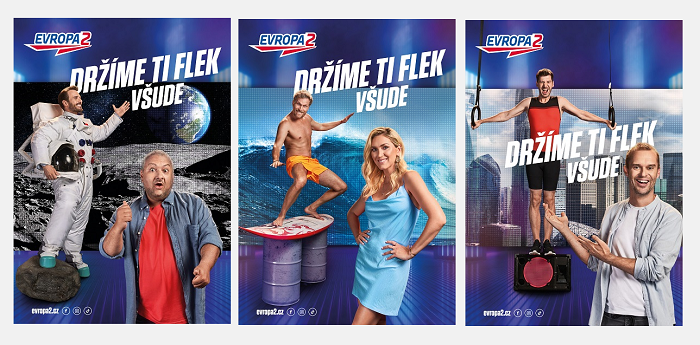 Hudební rádio Evropa 2 uvedlo novou kampaň, jejíž tváří jsou moderátoři stanice. Původní slogan Držíme ti flek v ní doplňuje o slovo všude, což podtrhuje i v jednotlivých vizuálech. Jeden se odehrává v kosmu, druhý na surfu a třetí na střeše mrakodrapu.