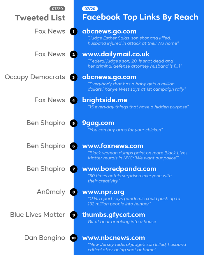 Při zohlednění celkového dosahu v „top ten“ nechybí třeba linky na portál 9GAG, který funguje de facto jako agregátor internetových memů, nebo na stránku plnou obrázků ve formátu GIF s názvem Gfycat. Do desítky nejsdílenějšího obsahu se ale dostalo třeba i neziskové sdružení amerických rozhlasových stanic NPR se zprávou o analýze Organizace spojených národů, podle které mohou kvůli následkům pandemie výrazně narůst počty hladovějících lidí ve světě. Pro Facebook jeho vlastní žebříček vyznívá relativně příznivě právě proto, že se v něm objevují poměrně rozmanité informační zdroje včetně těch bez výraznějšího názorového zabarvení.