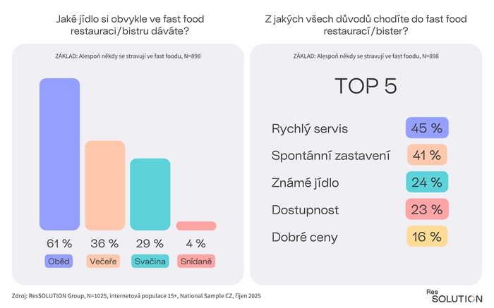 Nejčastějším důvodem návštěvy fast foodů je rychlý servis, který v aktuálním šetření předstihl spontánní zastavení. Dalšími motivy jsou jistota známého jídla, dobrá dostupnost a příznivé ceny.