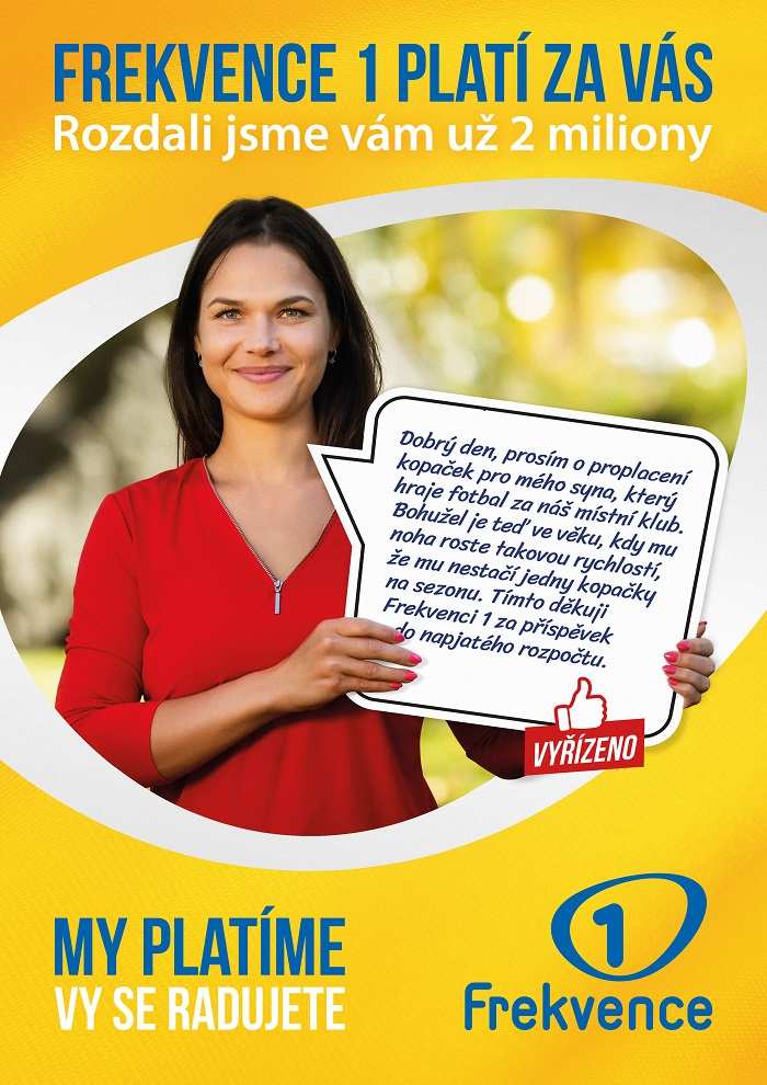 Rádio Frekvence 1 uvedlo novou kampaň. Slogan My platíme – vy se radujete vychází ze soutěže Frekvence 1 platí za vás, v jejímž rámci rádio rozdalo posluchačům odměny za více než 2 miliony korun. Nová kampaň zahrnuje čtyři vizuály s různými zážitky posluchačů. Příběhy vybrané pro kampaň jsou tak inspirovány skutečnými posluchači.