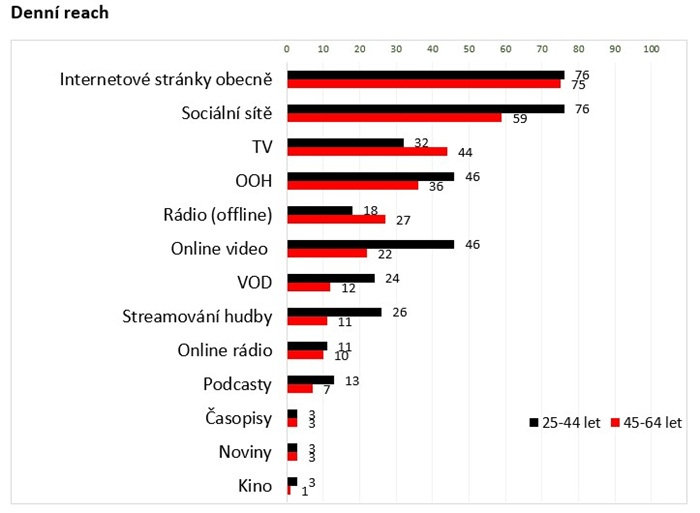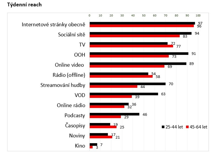 Kde je mezi oběma srovnávanými věkovými skupinami Čechů skutečně velký rozdíl je online video. Zatímco denní a týdenní reach online videa je u Čechů ve věku 25-44 let 46 % a 89 %, u Čechů ve věku 45-64 let je to jen 22 % a 69 %.