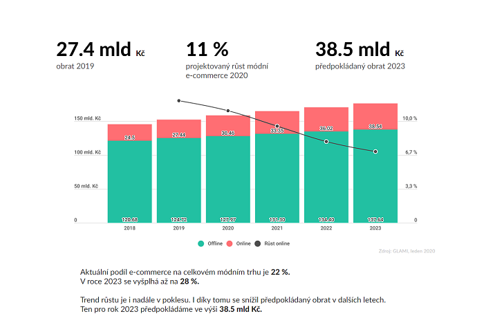 Český online trh s módou zaznamenal za loňský rok obrat 27,4 mld. korun. Očekává se ale, že růst trochu zpomalí. V roce 2023 by měl by očekávaný obrat představovat 38,5 mld. korun. Aktuální podíl e-commerce na celkovém módním trhu je 22 %, v roce 2023 by to mělo být 28 %.