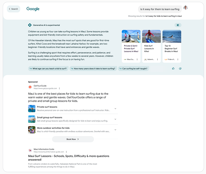 Z hlediska Googlu ale nakonec možná ta klíčová otázka tkví v tom, nakolik všechny nabíhající změny promění fungování a zobrazování inzerce. Stále více lidí podle všeho bude namísto klasického googlování (či bingování) konverzovat s inteligentními chatboty. Technologická firma si naléhavost tématu uvědomuje. „V nadcházejících měsících budeme experimentovat s reklamami ve Vyhledávání a Nakupování, které budou přímo integrovány do konverzačního režimu využívajícího umělou inteligenci," uvádí Google CR. „Pokud například někdo hledá ,outdoorové aktivity na Maui’ a dále zúží vyhledávání na ,aktivity pro děti’ a ,surfování’, může se mu zobrazit plně přizpůsobená reklama cestovní kanceláře nabízející lekce surfování pro děti," dodává firma. Další otázkou je, nakolik by uživatelé chtěli aktivně rozklikávat odkazy na webové stránky za situace, když by si mohli nechat v jednom jediném konverzačním okně shrnout prakticky jakýkoliv digitální obsah a žádné další stránky neotvírat.