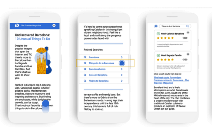 V kyberprostoru zřejmě přibude kontextové reklamy. Provozovatel vyhledávače Google tento týden oznámil přidání nového formátu Search for Content, s jehož pomocí by se podle americké firmy mělo správcům internetových stránek déle udržet pozornost návštěvníků. Pokud inovaci na svých webech vydavatelé povolí, uživatelé uvidí speciální googlovské tipy na klíčová slova a odkazy na články, které by je mohly na téže stránce zaujmout. Google uvádí jako příklad cestovatelskou stránku se čtením o Barceloně. V průběhu scrollování nový typ inzerce nabízí čtenářům odkazy na texty, které jsou nejlépe vystiženy klíčovými slovy jako „Co dělat v Barceloně“ nebo „Hotely v Barceloně.“ Po rozkliknutí doporučeného odkazu se reklama opět změní v závislosti na kontextu a najednou začne doporučovat článek o nejlepších tamních restauracích servírujících katalánskou kuchyni.