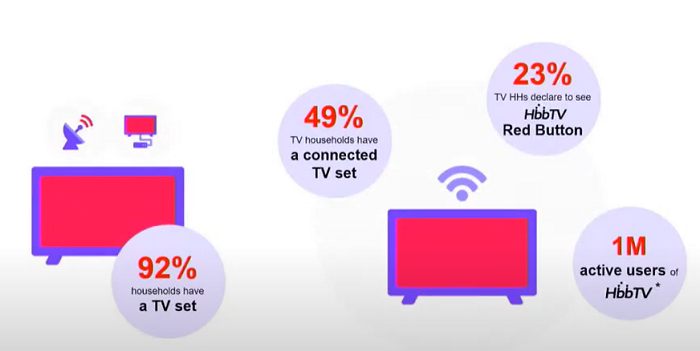 Počet aktivních uživatelů červeného tlačítka neboli HbbTV (hybridního TV vysílání) je na českém trhu podle dat ATO-Nielsen Admosphere jeden milion. V Česku má televizní přijímač 92 % domácností, z čehož 49 % domácností vlastní televizi připojenou k internetu. Necelá čtvrtina z domácností vlastnících TV přijímač (23 %) má přístup k HbbTV. Data byla prezentována na 10. ročníku mezinárodního HbbTV sympozia, které se v letošním roce koná v Praze.