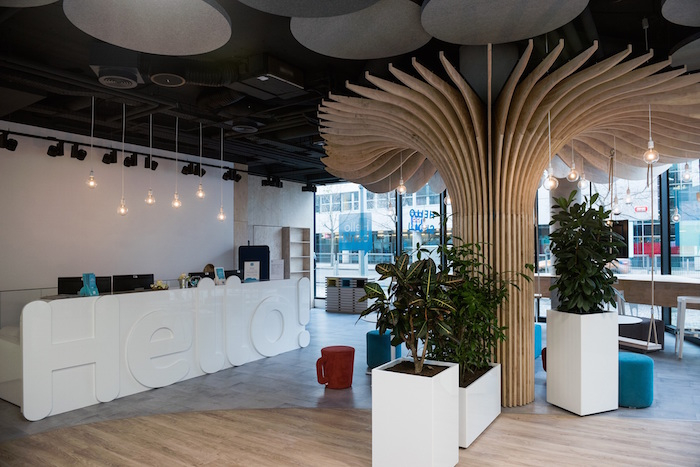 Hello bank! má také novou podobu poboček, pod níž je podepsána Erika Bohatá ze studia Capexus. Prostor je otevřen a transparentní, pracuje s modrou a bílou barvou. Součástí je i knihovna nebo například ping-pongový stůl.