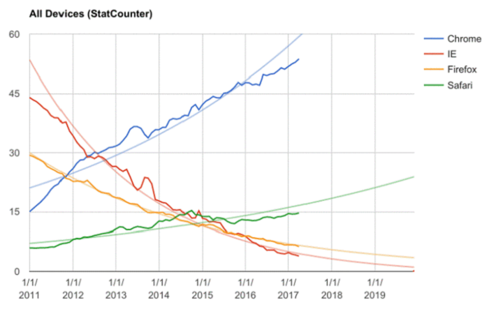 Vzhledem k jednoznačné dominanci Chromu na trhu prohlížečů se tomu všichni online vydavatelé musí přizpůsobit a budou muset přijít s méně invazivními způsoby online reklamy. Graf ukazuje vývoj podílů jednotlivých webových prohlížečů na všech platformách (desktop, smartphone, tablet) od roku 2011.