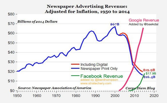 Graf zobrazuje vývoj reklamních příjmů (revenue) tradičních vydavatelských domů ve srovnání s online giganty Google a Facebook. Hodnoty jsou uvedeny v miliardách dolarů ročně od roku 1950. Nejlepší období měli tradiční vydavatelé ve druhé polovině 90. let. Google a Facebook jejich nynější příjmy hravě překonávají.