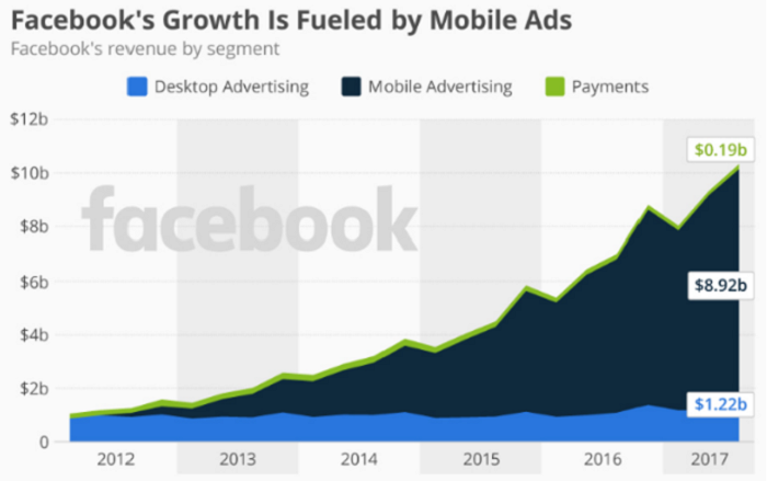Mimochodem, za obrovským růstem Facebooku stojí právě mobily. Následující graf ukazuje, že příjmy Facebooku z reklamy na desktop počítačích byly v posledních letech stabilní kolem úrovně 1,22 mld. dolarů ročně. Reklama na mobilních zařízeních však Facebooku přináší až 8x více.