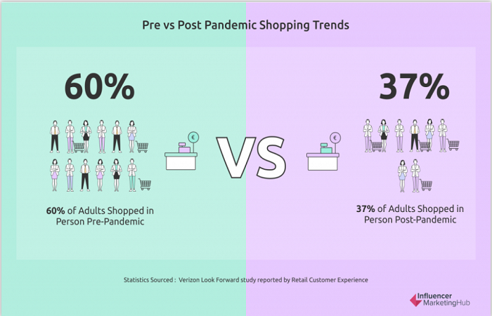 V posledních letech došlo k uzavírání řady kamenných prodejen, a ačkoli tento trend začal již před pandemií, ta celý proces urychlila a podpořila online nakupování. Podle studie Verizon Look Forward 60 % dospělých uvedlo, že před pandemií nakupovali hlavně v kamenných obchodech. Toto číslo nyní kleslo na 37 % a celých 42 % účastníků průzkumu navíc předpokládá, že za rok budou nakupovat stejně offline i online.