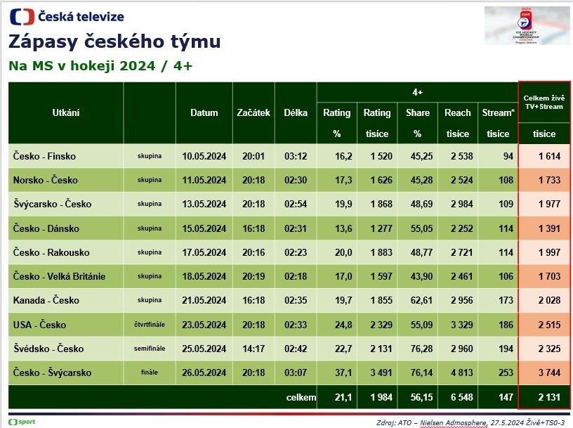letošního hokejového šampionátu na svůj historicky nejvyšší podíl. Po
