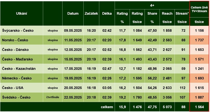 Celodenní podíl sportovního kanálu ČT sport se v době konání hokejového mistrovství světa (9.5.-25.5. 2025) vyšplhal na 12,93 % v divácké skupině starší 15 let. V uvedené divácké kategorii šlo o třetí nejlepší výsledek za TV Nova (16,61 %) a ČT1 (14,35 %). Ukazují to oficiální data sledovanosti ATO-Nielsen. Sportovní program České televize se během mistrovství stal sedmkrát lídrem trhu.