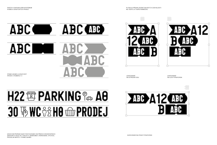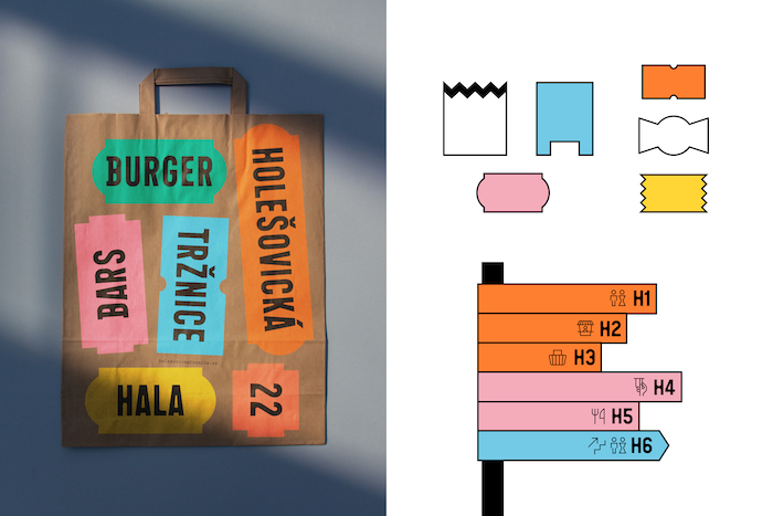 Vybrané písmo Animo (od české písmolijny Heavyweight) a grafické motivy odkazují na typické architektonické prvky tržnice, ale také na typickou estetiku prodejních míst – cenovky, vývěsní štíty, ukazatele nebo tabule. Ty mohou také evokovat ruch a rozmanitost trhového prostranství. „Tyto motivy se v kombinaci s písmem jeví jako ideální a přehledné řešení pro následnou tvorbu orientačního systému, který bude v tržnici výjimečně důležitý s ohledem na rozlehlost celého prostoru a šíři služeb,“ doplňují autoři.
