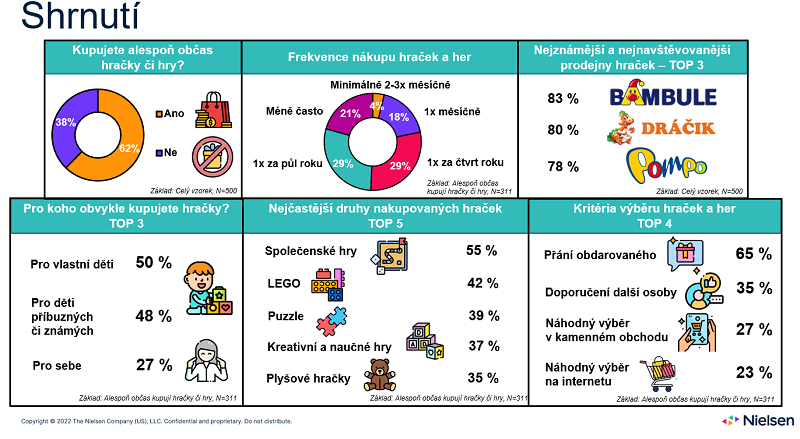 Mezi nejčastěji kupované druhy hraček patří společenské hry (55 %), Lego (42 %), puzzle (39 %) a kreativní a naučné hračky (37 %). Alespoň občas kupuje hračky či hry 62 % české internetové populace starší 15 let. Ukazuje to výzkum Nielsen Admosphere pro MediaGuru.cz.
