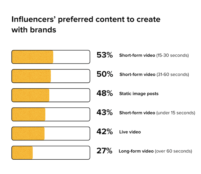 Nejraději tvoří influenceři krátká videa do 30 sekund (53 %) či do minuty (50 %) a také statické obrázky (48 %) či živá vysílání (42 %). Méně už chtějí dělat delší formáty (27 %), rozhovory (19 %) či přebírat obsah od značky (14 %), a to zejména z toho důvodu, že je to náročné na čas a představuje to větší riziko.