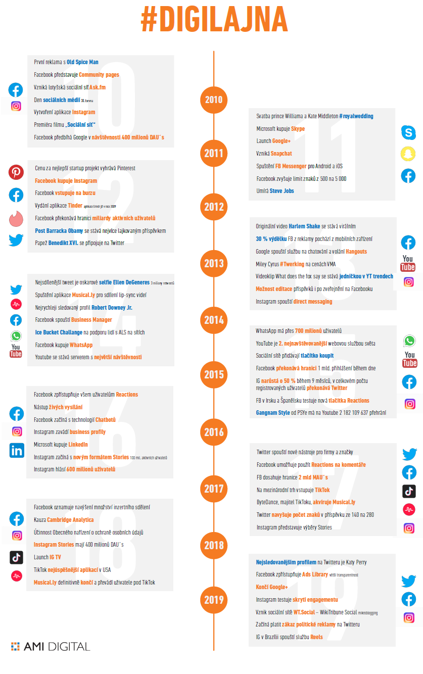 Letos je to deset let, co byl vytvořen Instagram, devět let, co Microsoft koupil Skype, vznikl Snapchat a odstartoval Google+, který loni skončil, a osm let, co světlo světa spatřil Tinder. Historie sociálních médií je mladá a rychlá. Před deseti lety sítě především propojovaly lidi, dnes významně ovlivňují reklamní byznys i politické volby. Pro připomenutí milníků jejich posledních deseti let, přinášíme infografiku, kterou připravila agentura AMI Digital.