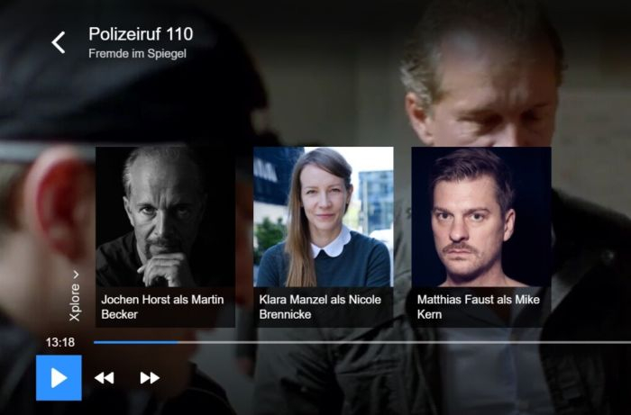Diváci německé veřejnoprávní televize rbb si mohli spustit službu Xplore prostřednictvím dlaždice 'Polizeiruf 110' v ARD menu prostřednictvím HbbTV, tedy virtuálního červeného tlačítka. Jakmile došlo k pozastavení pořadu, objevily se fotky a jména obsazených herců a lokací, které vedou přímo k detailním informacím prostřednictvím dálkového ovládání. Na konci pořadu pak bylo možné všechny informace vyvolat ve formě přehledu.