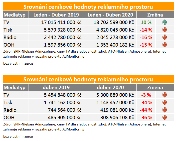 V přehledu není uveden vývoj v internetové reklamě, protože monitoring postihuje jen display reklamu a video reklamu. Ta se podle dat AdMonitoringu v dubnu ve srovnání s letošním březnem snížila zhruba o třetinu.