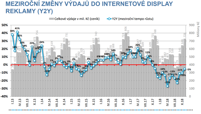 Na druhou stranu v letošním roce klesá oproti loňskému roku objem monitorovaných investic do bannerové (display) reklamy. Za období leden až listopad 2018 naznačuje montoring meziroční snížení v průměru o 14 %. Po celý letošní rok jsou investice do bannerové reklamy pod úrovní loňského roku. K nejsilnějším provozovatelům na internetu podle celkových reklamních výkonů patří Seznam.cz, Mafra a Czech News Center.