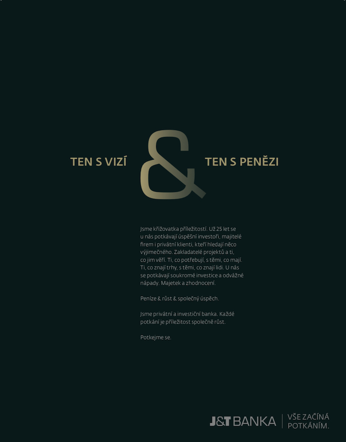 „Vše začíná potkáním“ je nejen claim nové kampaně, ale dalo by se bez nadsázky říct, že i DNA celé firmy. Před 25 lety vše odstartovalo potkání Patrika Tkáče s Ivanem Jakabovičem, díky němuž vznikla společnost J&T, a ta se od té doby stala křižovatkou příležitostí, na které se potkávají investoři, majitelé firem, lidé s vizí a nápady, zakladatelé projektů, lídři, talenti, sběratelé, umělci a mnoho dalších. Zkráceně by se dalo říct, že se zde potkávají investice s odvážnými nápady. A s tím se hezky pracuje i v samotné kampani. Nemusíme nic vymýšlet, zkrátka říkáme, na čem je celá společnost založená a díky čemu jsme dnes hlavním partnerem česko-slovenského byznysu.