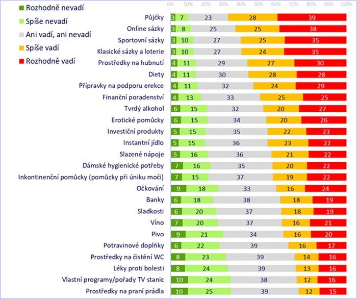 Chtěli jsme také vědět, jak si stojí vnímání reklamy na různé typy zboží a služeb. Vybrali jsme 25 z nich. Od takových, kde jsme žádné kontroverze nečekali (jako jakýsi benchmark), až po ty, kde jsme je tušili, ale chtěli jsme to mít změřené.