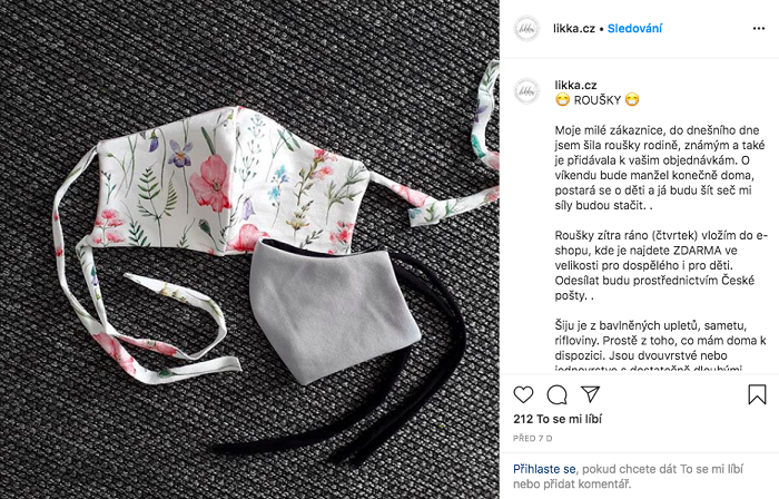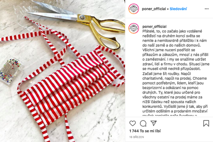 Dlouho na sebe nenechali čekat ani módní značky a designéři. Ti nejsolidárnější z nich navíc roušky nabízejí zdarma za cenu poštovného a nebo je šijí pro potřebné.