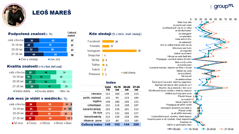 A co všechno tedy o vybraných influencerech víme? Níže vidíte příklad profilu (karty) Leoše Mareše. Víme, kolik procent lidí v cílové skupině ho sleduje a zná. Víme také, jak si lidé myslí, že danou osobu znají – zda jen zběžně, nebo ji opravdu sledují. Zajímá nás i to, zda už danou osobou nejsou lidé třeba přesyceni (jak moc je vidět v médiích). Jak je patrné z Leošovy karty, zrovna u něj je skoro čtvrtina lidí toho názoru, že je ho už všude moc.