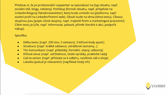 Pro dosažení co nejlepších výsledků je klíčové, jakým způsobem zadáváme pokyny neboli prompt. Čím konkrétnější a podrobnější je zadání, tím kvalitnější a relevantnější bude výstup. Oldřiška Hradcová doporučuje používat co nejvíce detailů – například definovat, pro jaký účel text slouží, kdo je jeho cílová skupina a jaký tón je žádoucí. Užitečné je také specifikovat roli, kterou má ChatGPT hrát, např. „Představ si, že jsi copywriter pro marketingovou kampaň“ – to pomáhá nasměrovat AI na správnou cestu a přizpůsobit výstup konkrétní situaci.