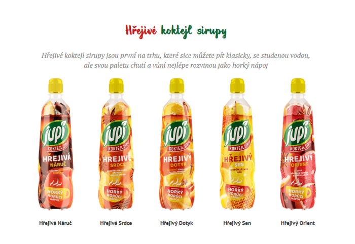 Značka Jupí na trhu uvádí novou řadu svých sirupů. Hřejivé koktejl sirupy je možné pít se studenou vodou, ale plně se rozvinou jako horký nápoj.