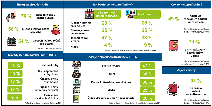 Papírové knihy nakupují tři čtvrtiny dotázané tuzemské online populace. Více než polovina pořizuje alespoň jednou ročně knihy pro někoho jiného než sebe, 50 % jich kupuje knihy pro sebe. Vyplývá to z výzkumu Ressolution Group pro MediaGuru.cz.
