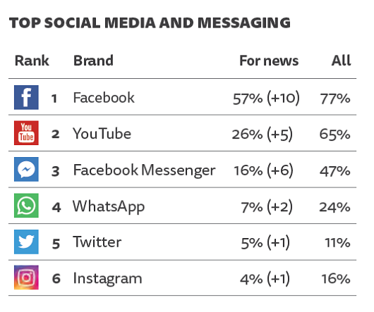 Kromě Facebooku konzumují Češi zprávy také přes další sociální sítě – YouTube (26 %), Messenger (16 %), WhatsApp (7 %), Twitter (5 %) a Instagram (4 %). Role chatovacích aplikací ostatně sílí po celém světě, lidé na nich oceňují především větší míru soukromí. Počet uživatelů konzumujících zprávy přes WhatsApp se od roku 2014 celosvětově ztrojnásobil. Nejvíce lidí ji používá v Malajsii (54 %) a Brazílii (48 %). Jak ukazují ale nedávné události z Indie, kde zprávy sdílené přes WhatsApp vyústily v násilnosti, i zde existuje vážné nebezpečí falešných a poplašných zpráv.