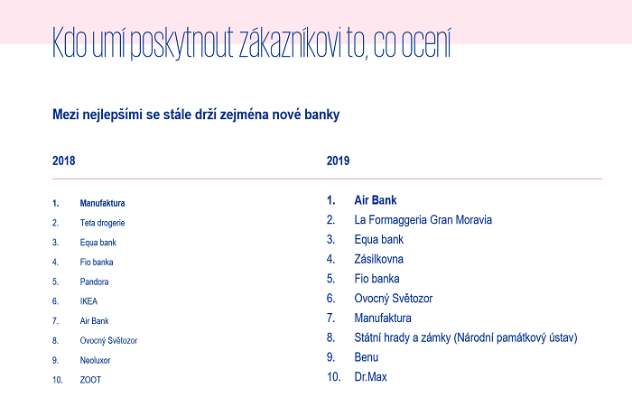 První místo v žebříčku obsadila Air Bank, druhá je La Formaggeria Gran Moravia, třetí skončila Equa bank. Zajímavé je, že mezi prvními pěti nejlepšími jsou hned tři banky. „V tom je Česká republika unikátní, to nikde jinde není. Pak jsou tam pochutiny jako La Formaggeria Gran Moravia a Ovocný Světozor, což nevypovídá jen kvalitě produktu, ale že i nákup produktu může být dobře zvládnutým zákaznickým zážitkem,“ doplňuje Jan Klimeš, CX Expert Customer Center of Excellence KPMG.